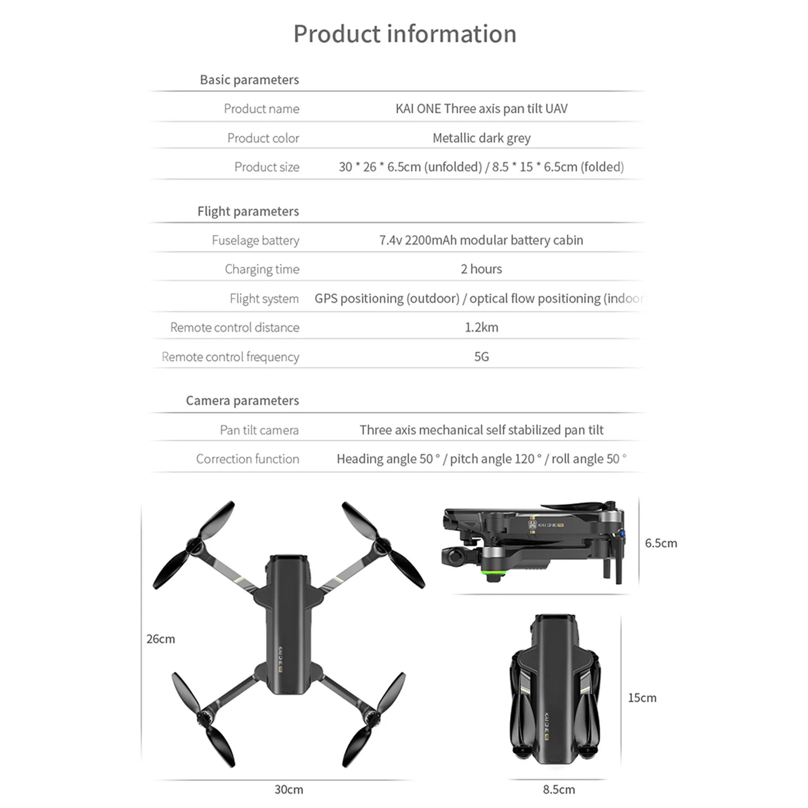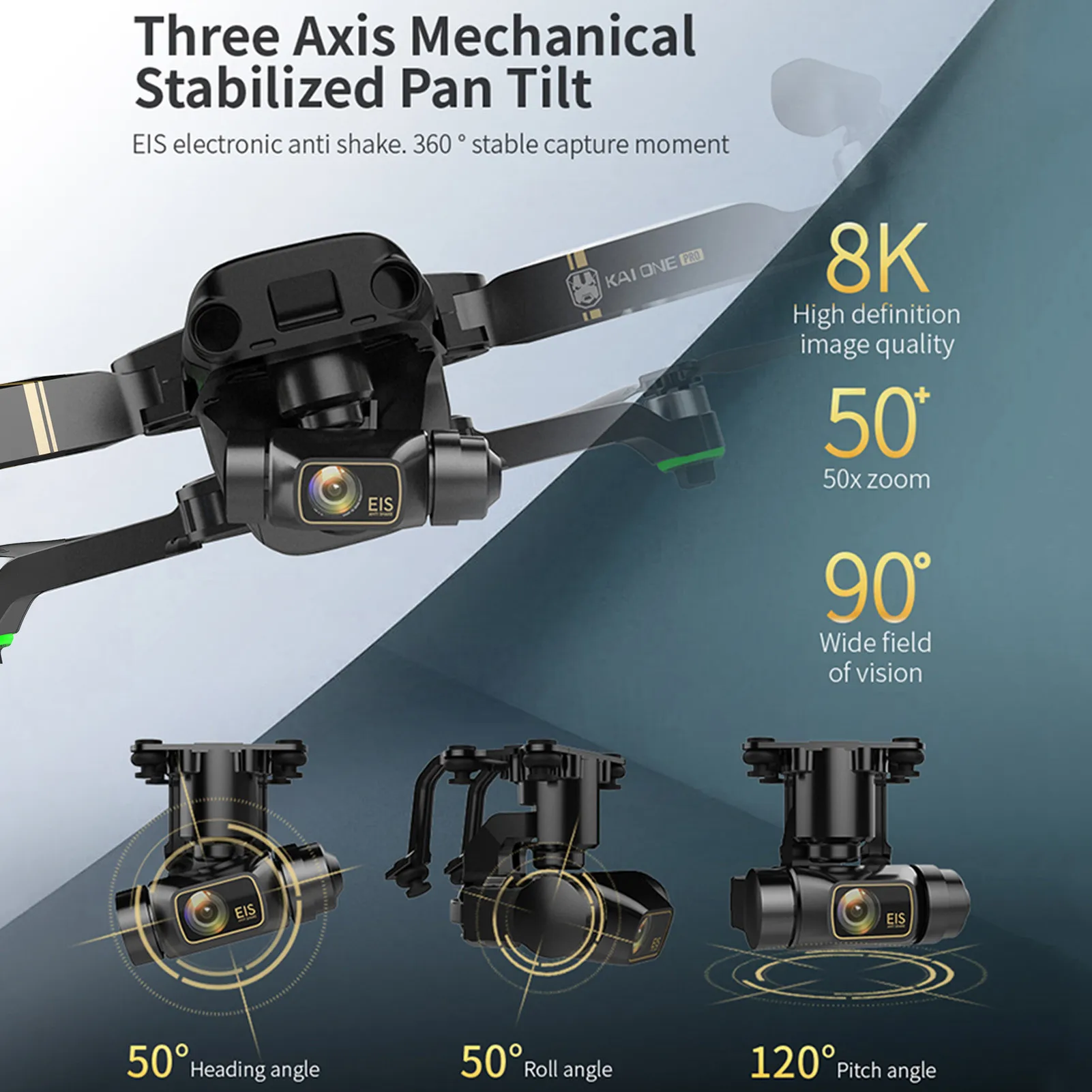 Gimbal: 3-axis (heading angle 50°/pitch angle 120°/roll angle 50°)