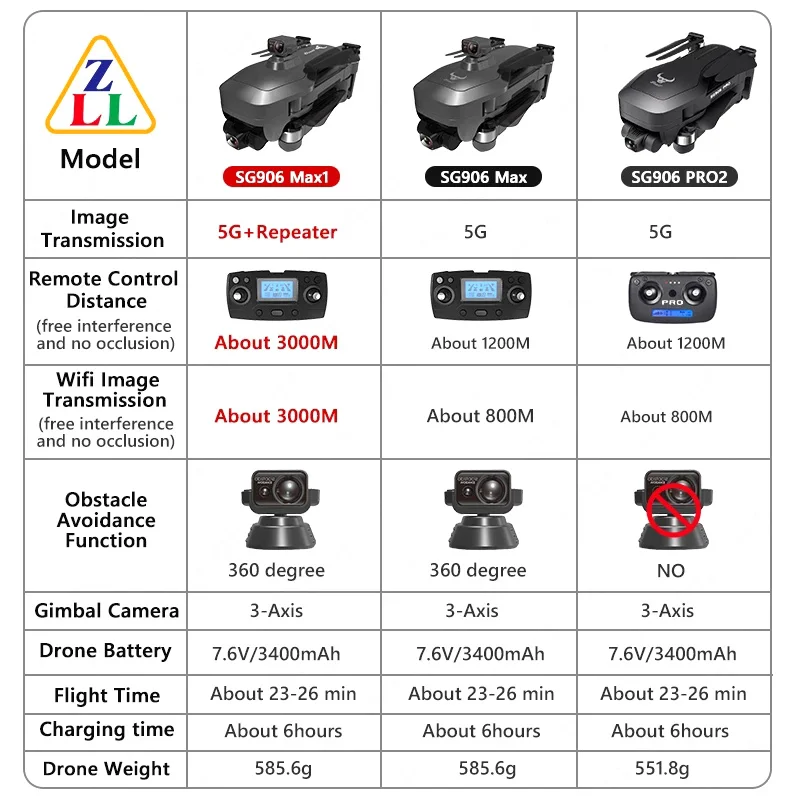 The parameter comparison of SG906 MAX1 SG906MAX ,SG906 PRO2 and SG906 PRO are shown in the figure below, please compare carefully.
