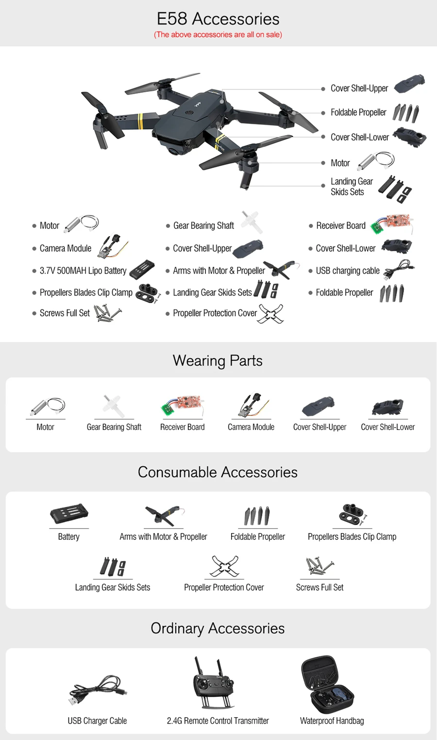 1 x E58 RC Quadcopter1 x Transmitter1 or 2/3 x 3.7V 500mAh Lipo Battery (Option)1 x USB Charging Cable4 x Protection Cover4 x Spare1 x screwdriver