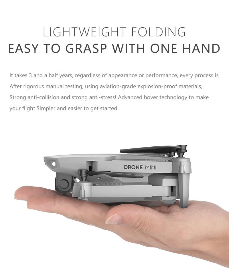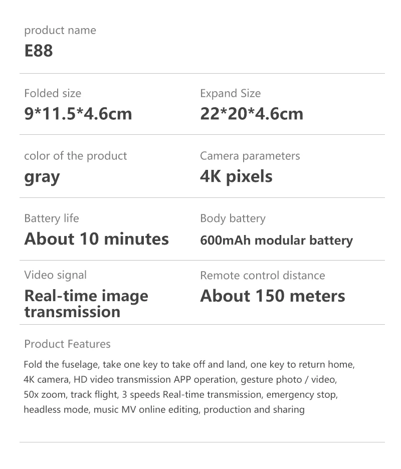 Functions: up / down, forward / backward, turn left / right, side flight, three-level flight speed, LED lights, headless mode, one-key automatic return, altitude hold mode, WIFi transmission