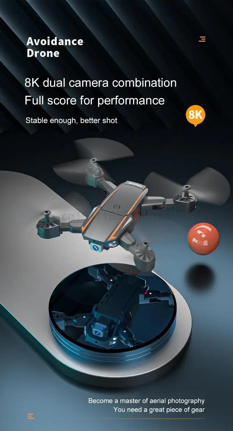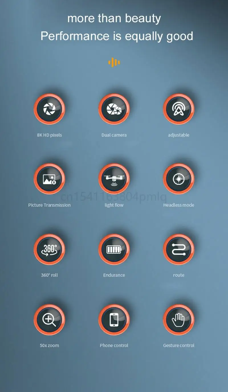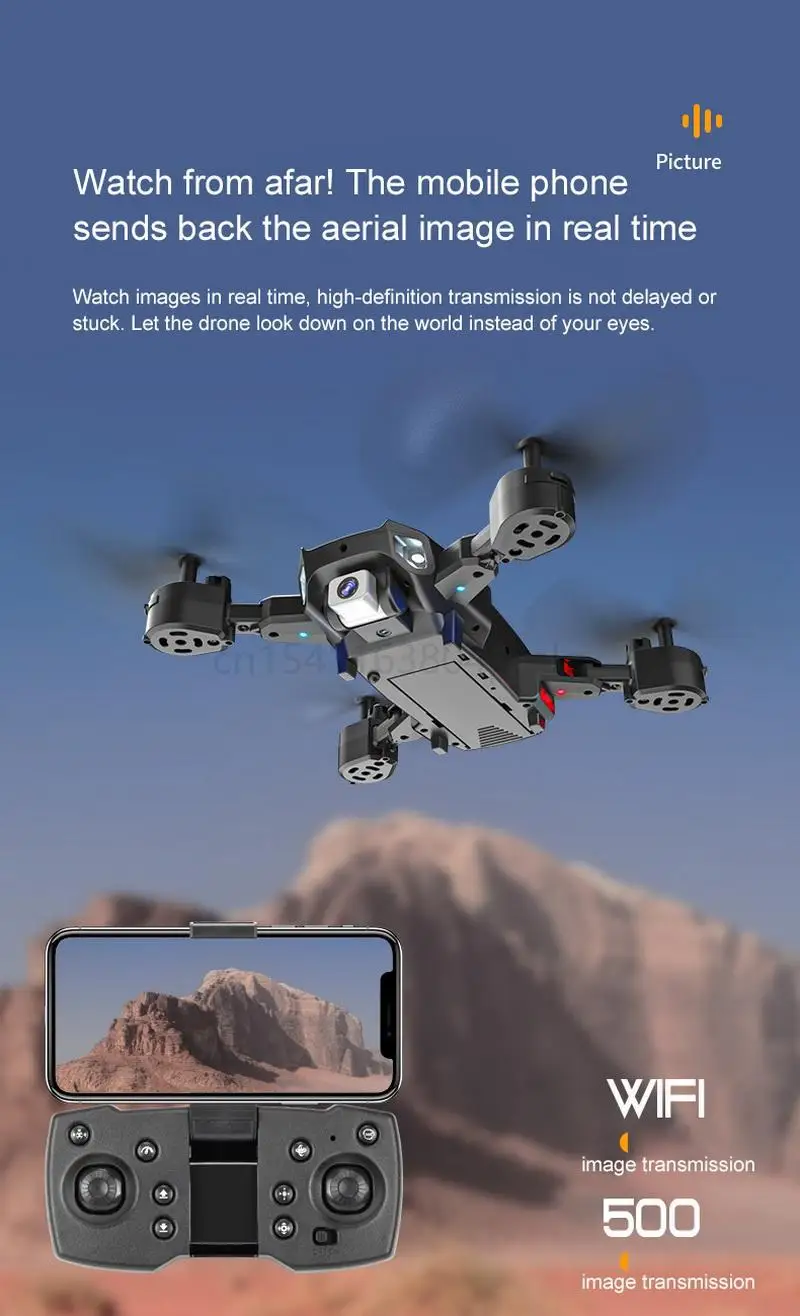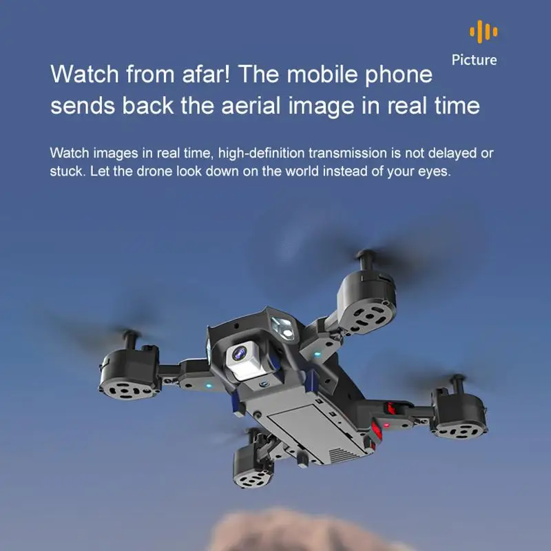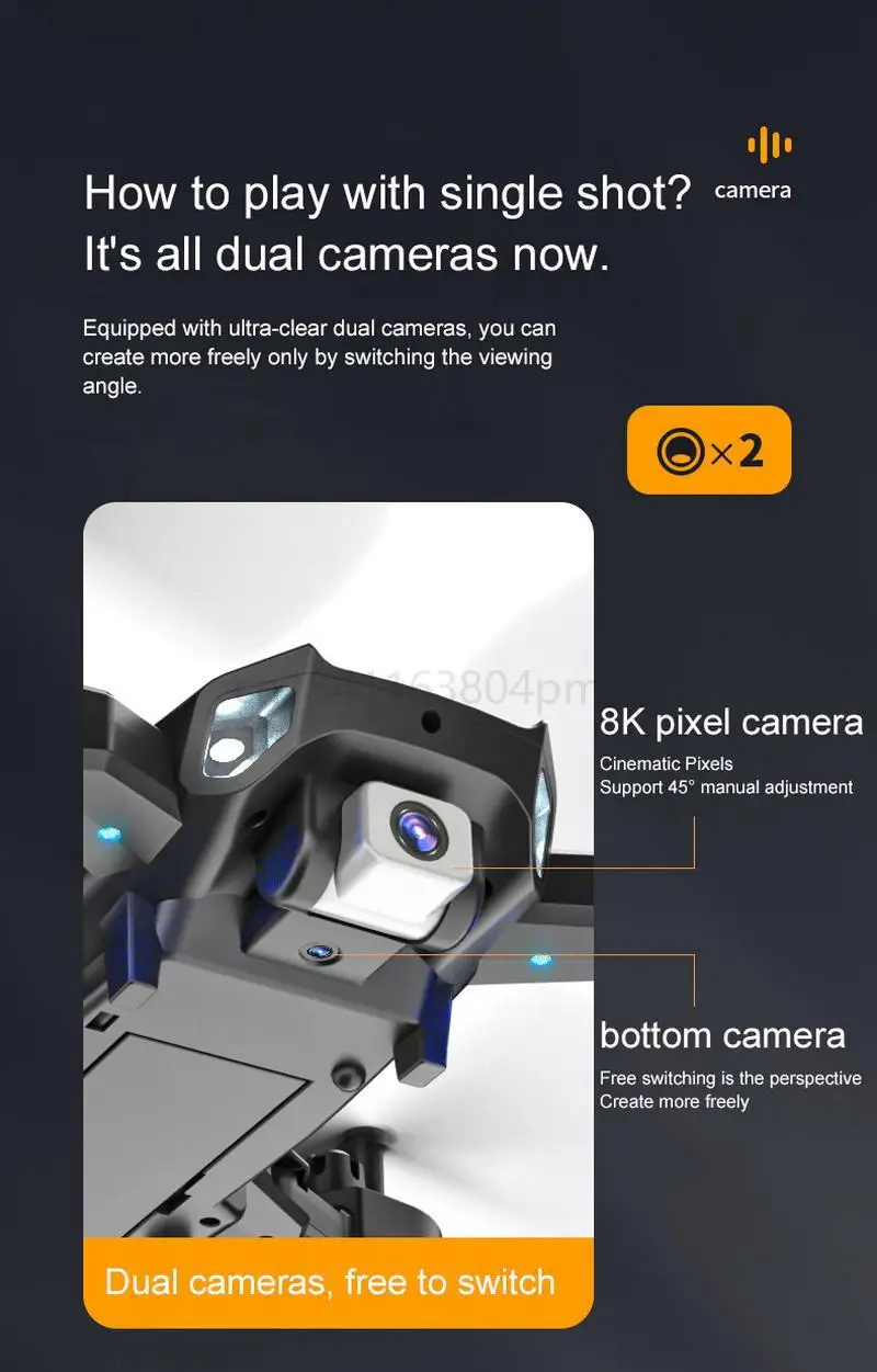 1:8K aerial photography, dual camera switching, obstacle avoidance flight, optical flow hovering real-time image transmission, route flight, gesture photography, 360° roll in headless mode, one-key take-off/landing, 50x zoom mobile phone remote control, foldable body, modular Battery.