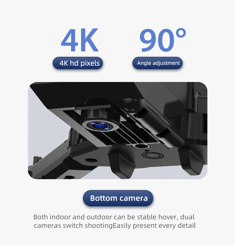 1、4K Ultra HD Camera: 90° adjustable camera can provide stunning 4K Ultra HD picture quality and 1080P video, offering amazing clarity, deep contrast and vivid colors. The large-capacity modular battery can provide about 20 minutes of flight time.