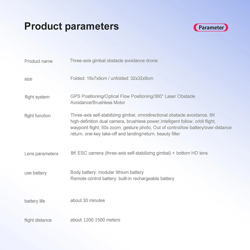 Feature: Function: 5G brushless GPS folding drone with obstacle avoidance, dual WiFi professional aerial camera: wide-angle 8K high-definition WiFi on the front lens, bottom high-definition 1080P with optical flow to switch the camera angle, precise positioning, long battery life 7.4V large battery, Low power/out-of-control/over-distance can return, intelligent follow, fly around point, double fold, APP mobile phone control, custom route, one-key return, ascend/descend, forward and backward, left and right side flight, headless mode, automatic switch light Streaming/GPS, LCD display (remote control rechargeable). Headless mode allows you to control the drone even when you can’t see it. Brushless GPS, precise positioning, long battery life, low battery can return, with radar obstacle avoidance. The aircraft can perform 360° roll performance in the air, which is very ornamental. In addition, LED lights on the head and tail can also add fun to flying at night. The speed control function makes it possible to adjust according to preference.Specification: Motor: (Brushed Motor) Model: S135 Main material: ABS plastic and electronic components Size: 32x32x10cm/12.6×12.6×3.94in (expanded size), 7x18x9cm/2.76×7.09×3.54in (folded size) Color: Black, Grey Channel: 4CH Gyroscope: 6 Axis Maximum flight time: 25-28 minutes Long-distance distance: 1200-1500 meters Operating frequency: 5GHz Applicable age: 14+ Aircraft battery capacity: 3000mAh battery Modular Voltage: 7.4V Charging time: about 2 hours Remote control battery: Built-in rechargeable battery Packing size: 30x22x10cm/11.81×8.66×3.94in Bare metal weight: 243g Type: A 1 X Battery, B 2 X Batteries, C 3 X Batteries Note:
