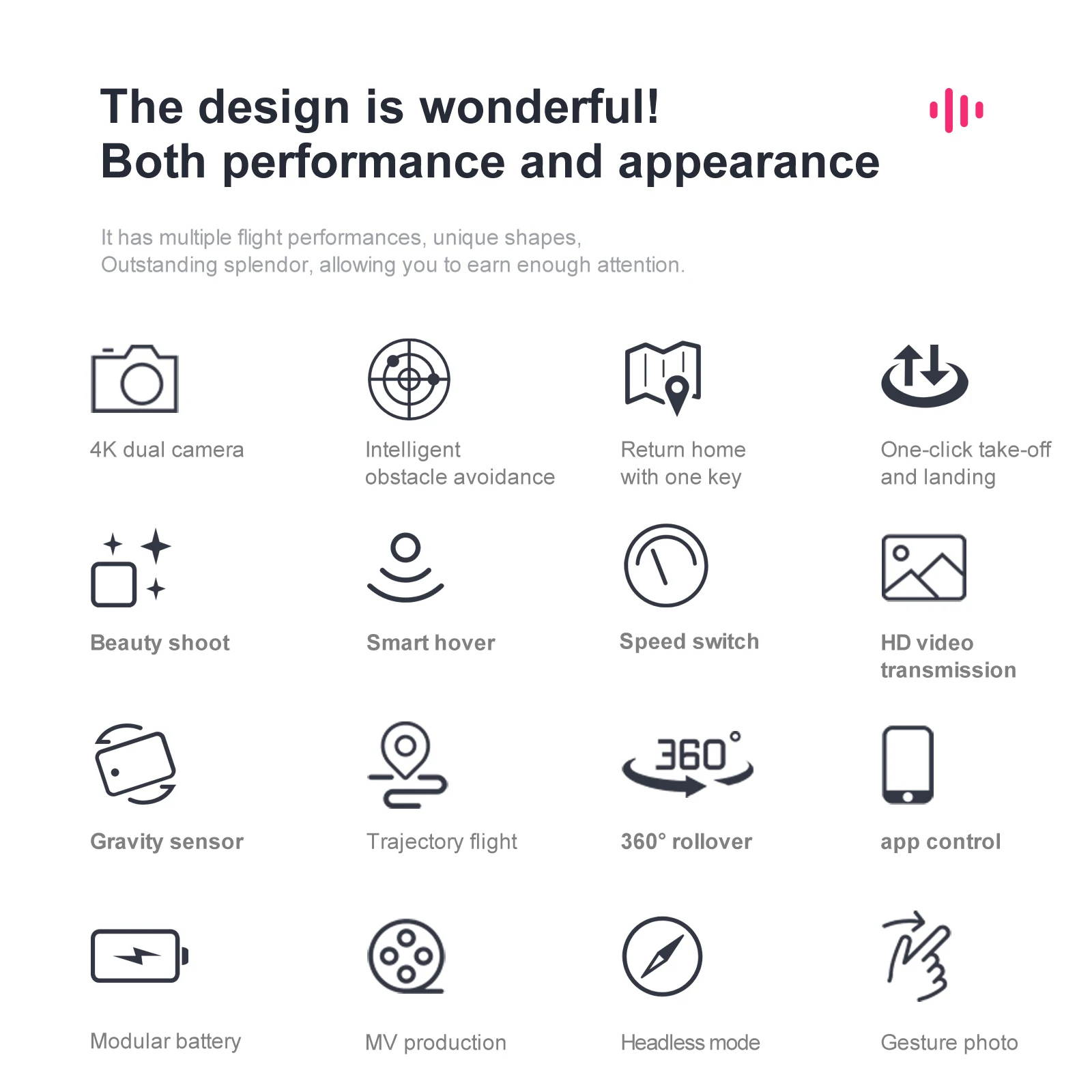 1. Both performance and appearance. With multiple flight performances, unique shapes and unique colors, you can earn enough attention.