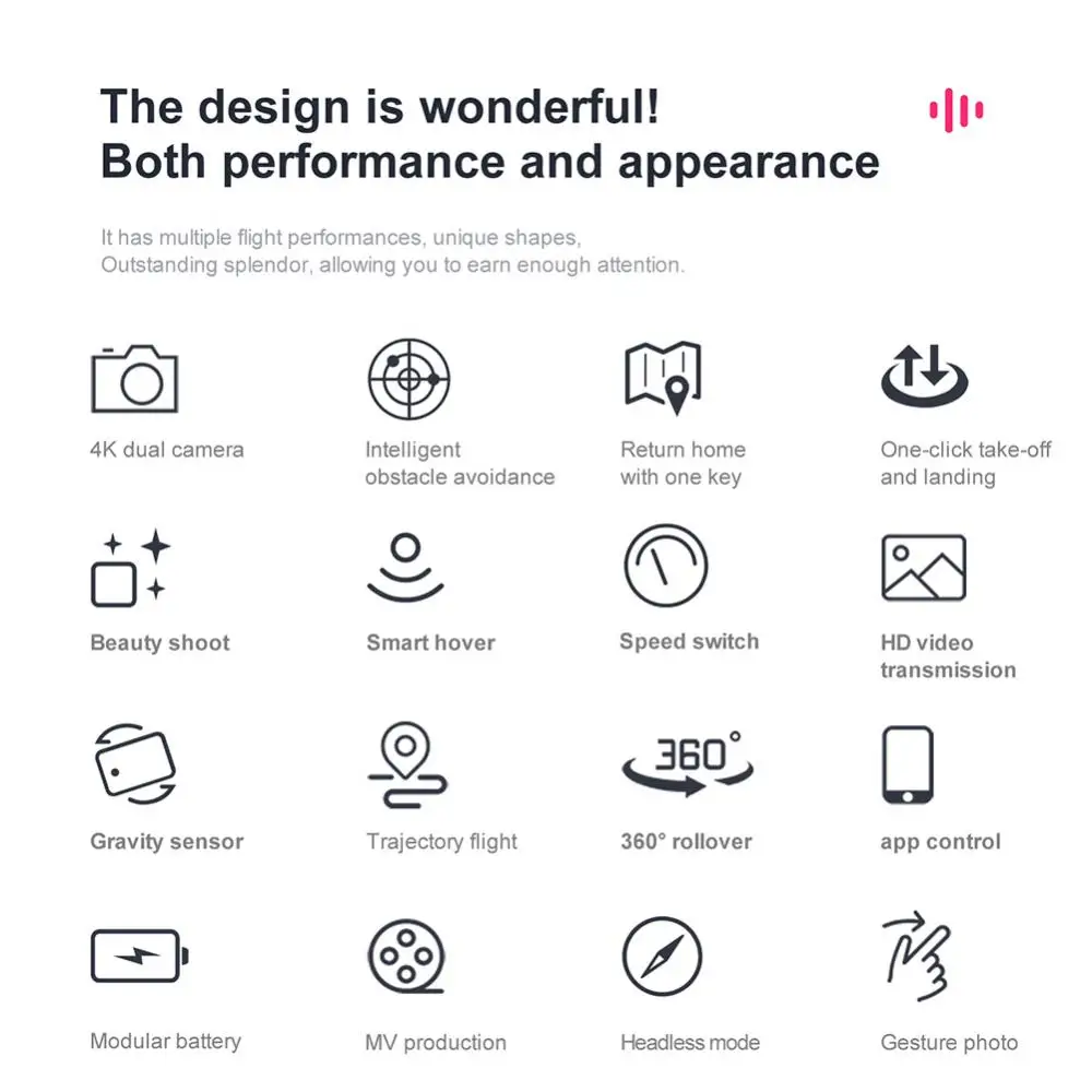 One-key take-off/one-key landing/up/down/left/right turn/360° roll/headless mode/fast/slow gear/photograph/video/switch dual camera/face recognition automatic photo/gravity sensor/track flight
