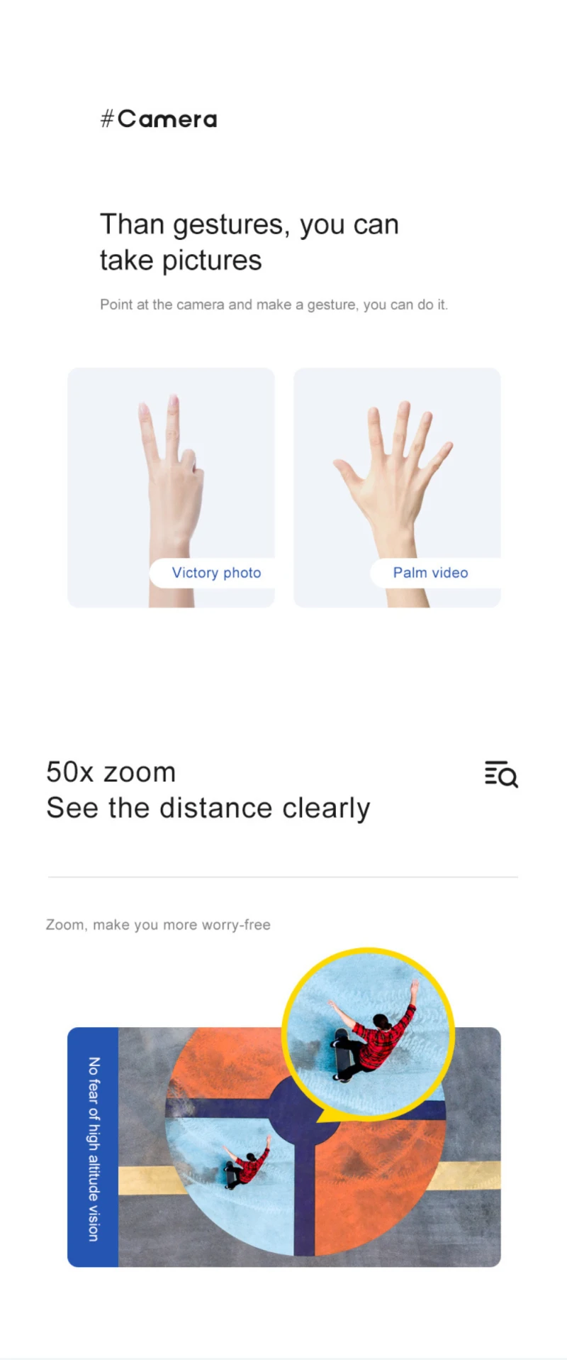 Zoom at 50x to see the distance clearly, and Eis electronic anti-shake technology is more stable and clearer, which can effectively reduce the shooting blur. With high-definition dual cameras, the picture magnification is still clear.