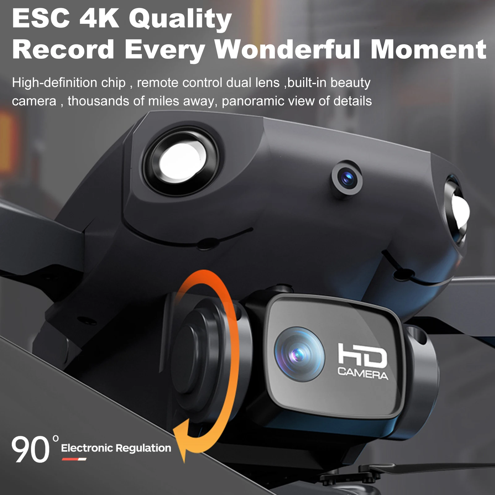 Functions: Sideward flight, turn left/right, up/down, forward/backward, obstacle avoidance, ESC Lens, 4K dual camera, one key take off/landing/, 3D flip, waypoint flight, headless mode, gesture control.