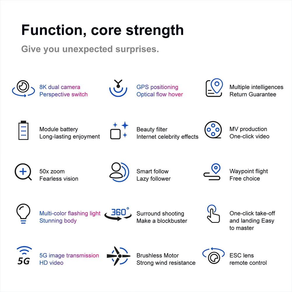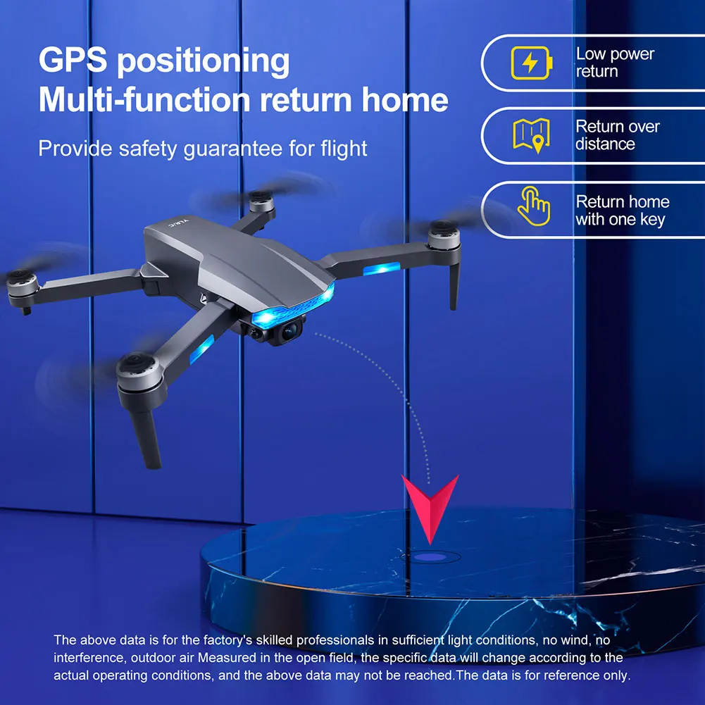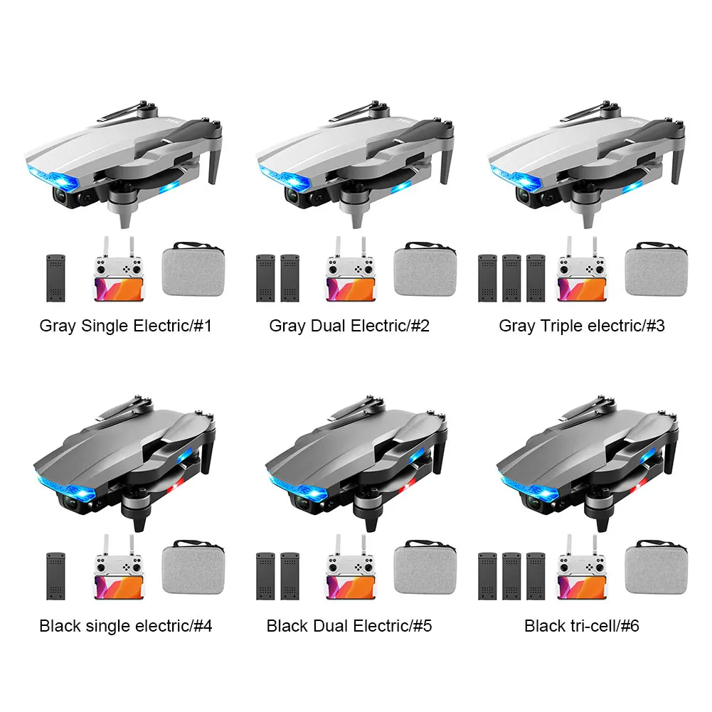 Feature: 1. Folding function, easy to carry. 5G dual antenna, brushless motor, GPS with optical flow positioning, electric adjustment of WIFI. 2. The front lens is placed with 8K high-definition WIFI, and the bottom high-definition WIFI with optical flow can switch the camera angle. 3. Precise positioning, 7.4V large battery, long battery life, low power / runaway / ultra-distance can return. 4. Intelligent follow, fly around point, double fold (blade, wing), APP mobile phone control, custom route, one-key return, ascent and descent, forward and backward, left and right side flight, headless mode, automatic switching of optical flow / GPS.Specification: Model: S106 Color: Grey, Black (optional) Remote control battery: AA battery X 3 (not included) Operation mode: Remote control/APP control Frequency: 5G image transmission Gyroscope: 6-Axis Channel: 4CH Charging method: USB interface Battery capacity: 7.6V 3000mAh modular battery (brushless battery) Flight time: about 25 minutes Charging time: about 100 minutes Image transmission distance (without interference): about 250-300 meters Follow distance: within 3-4 meters Remote control distance: Actual height 120m/ long distance distance 500m Packing: Portable zipper box + carton Product size (open): 27x27x5.5cm/10.63×10.63×2.17in Product size (close): 14.5x9x5.5cm/5.71×3.54×2.17in Body weight: 181g (airplane + battery) Note: